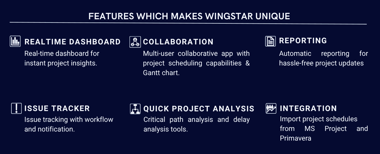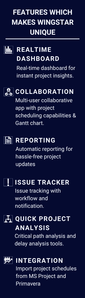 Our proprietary software, WINGSTAR, streamlines project planning, tracking, and team collaboration. It enables project-wide data acquisition, real-time progress analysis, and actionable insights—reducing manual effort for planners and managers while driving smarter and faster project decisions.